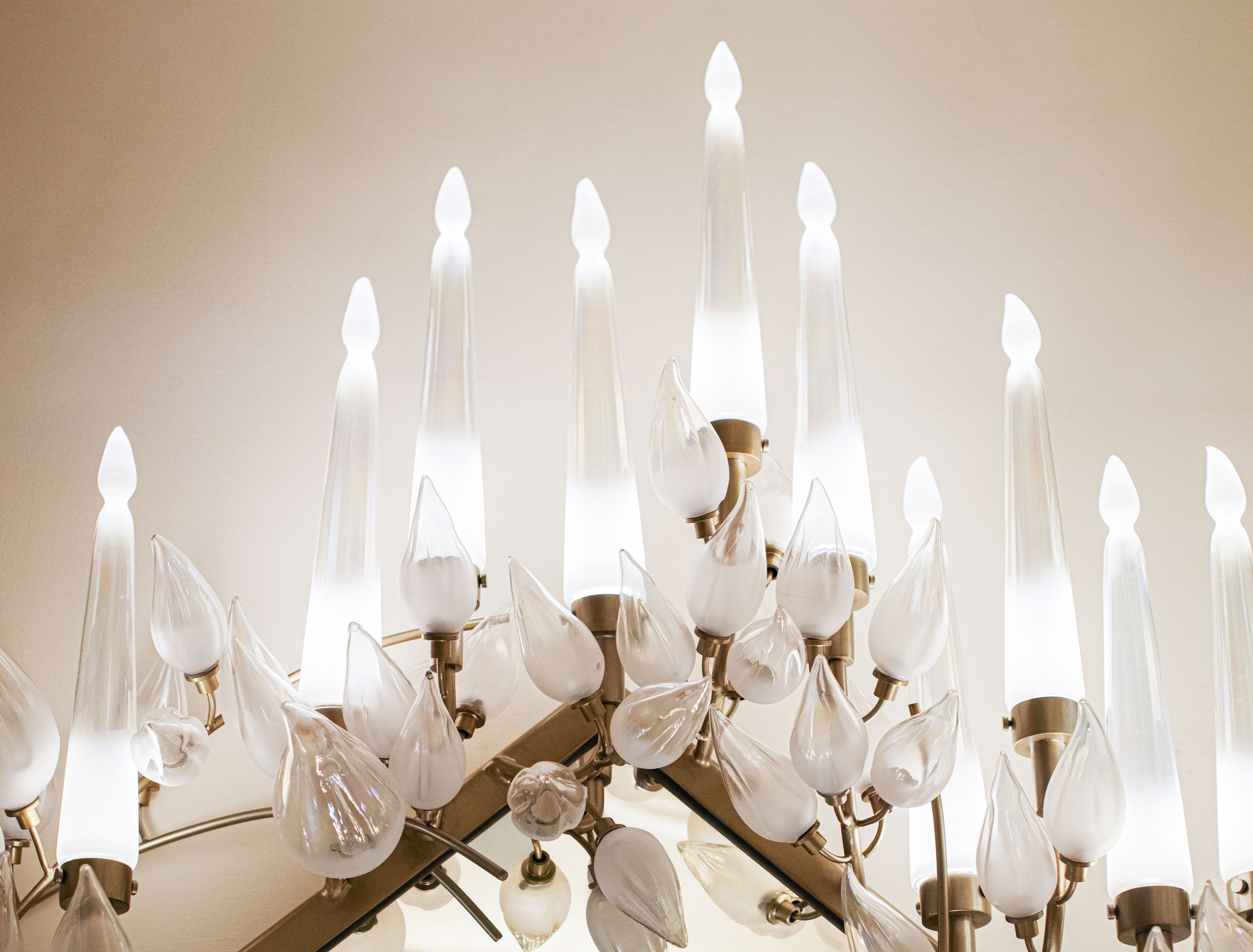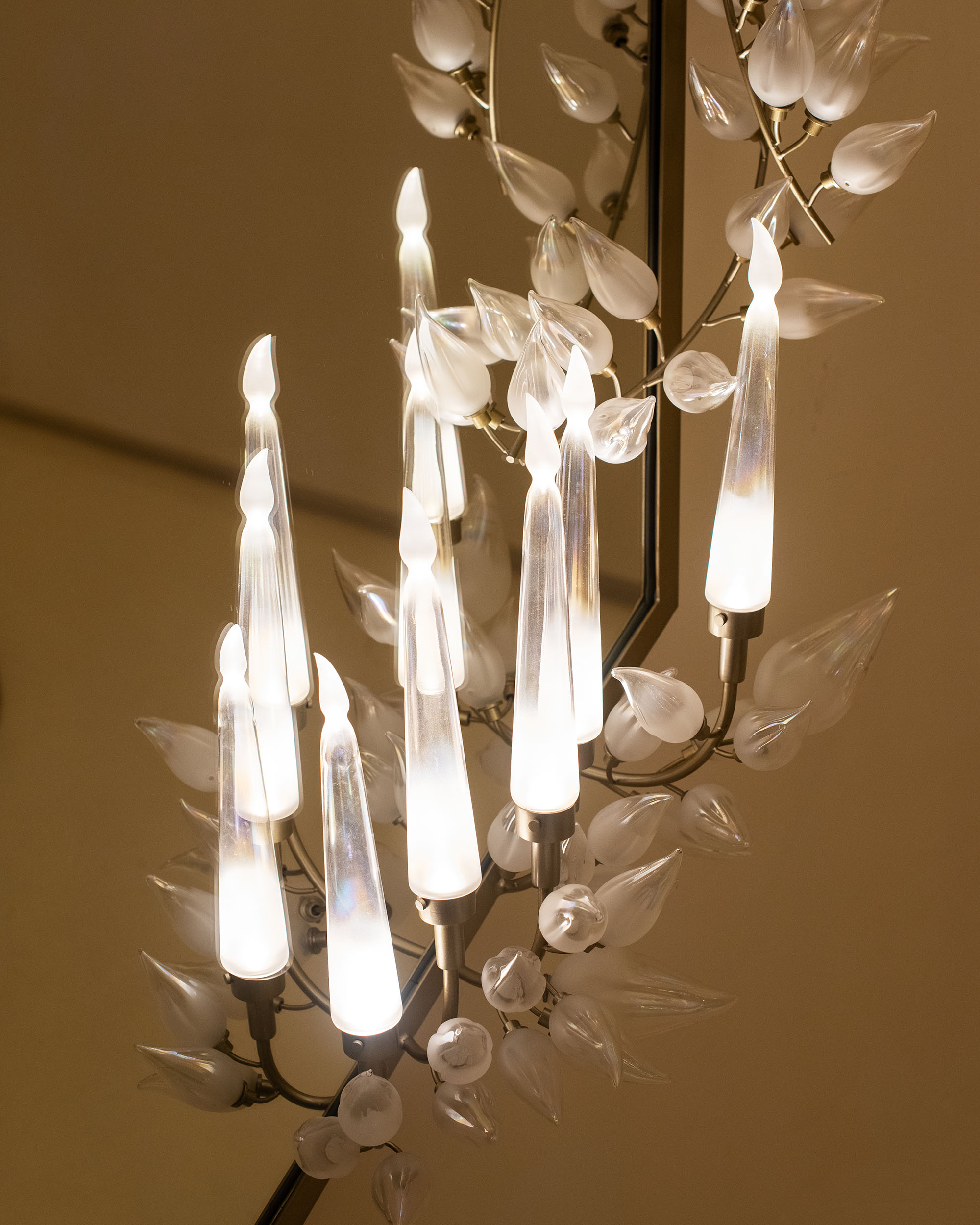 Each chandelier unfolds like a luminous canopy, its delicate, hand-blown glass leaves suspended in bloom. Light filters through each translucent form, scattering reflections across the room in a spectacle of warmth and grandeur. Above dining tables, galleries, or grand halls, it is both illumination and architecture, becoming a contemporary fresco of light
