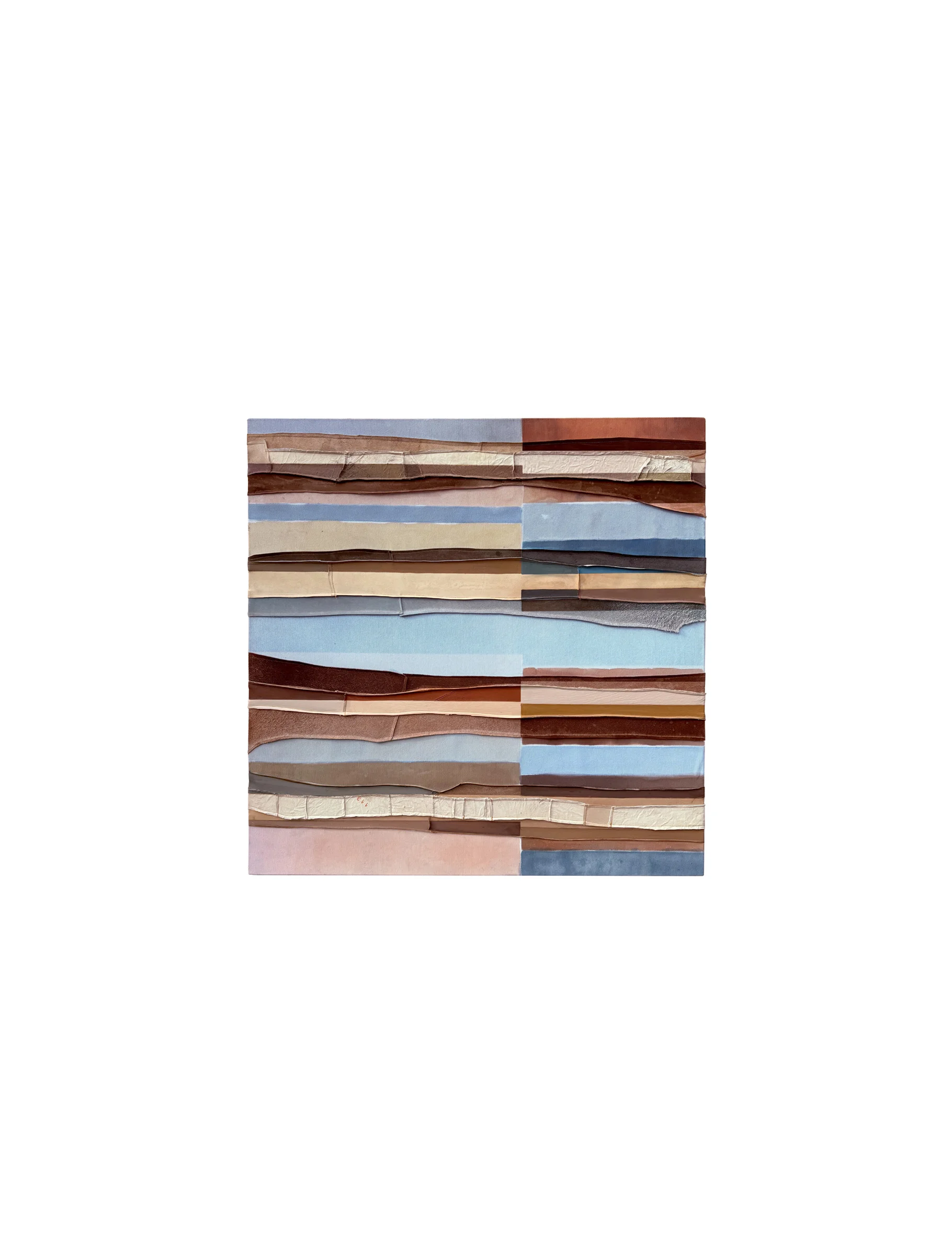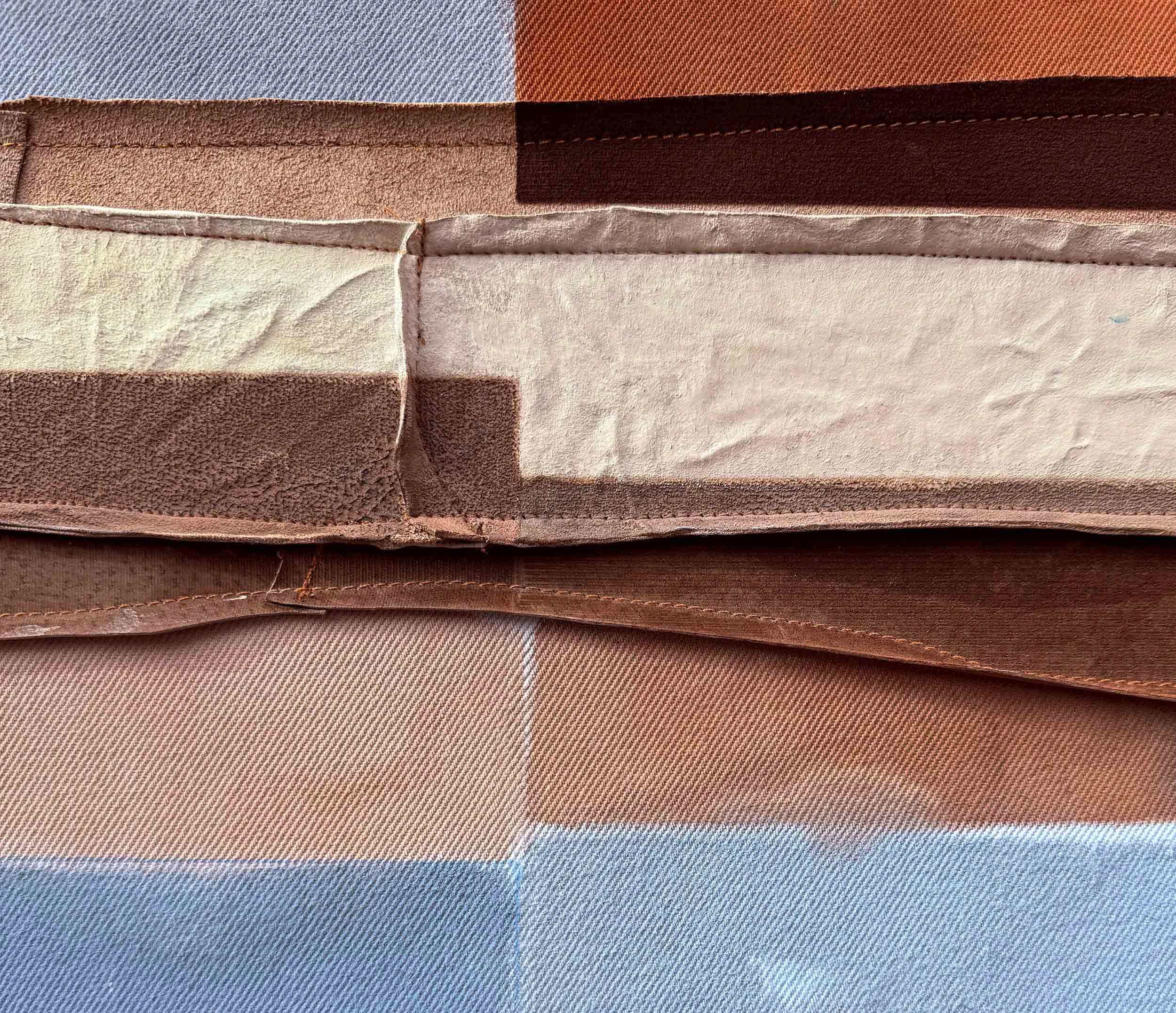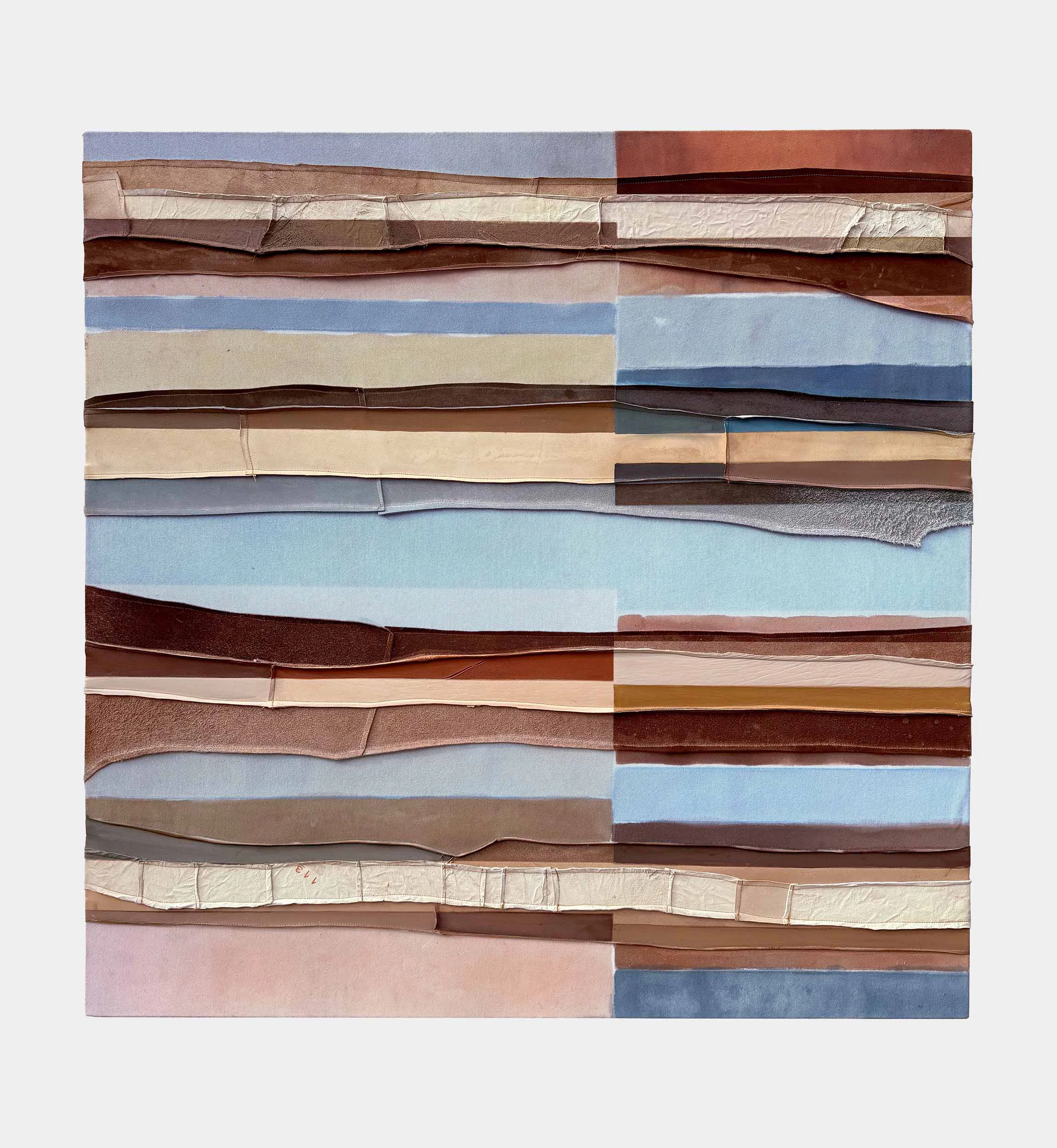 Azulay’s materials—hand-cut textiles, repurposed leathers, and layered threads—are composed with a deliberate sensitivity to both repetition and variation. The surface of each work is constructed through a process of incremental assembly, where stripes appear not as decorative pattern but as registers of tempo, irregular yet precise. The resulting compositions suggest an embodied rhythm discovered and refined through the act of making