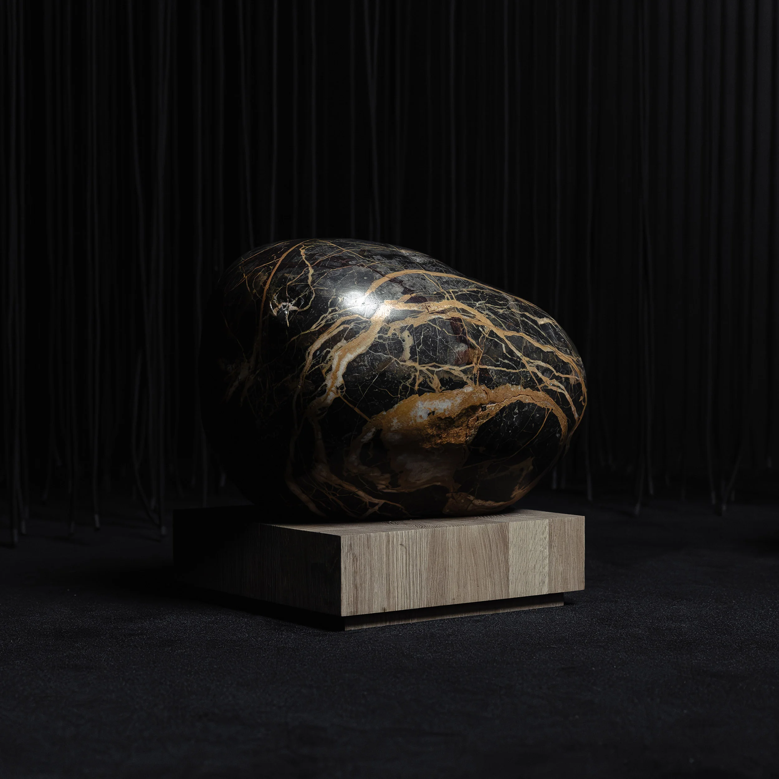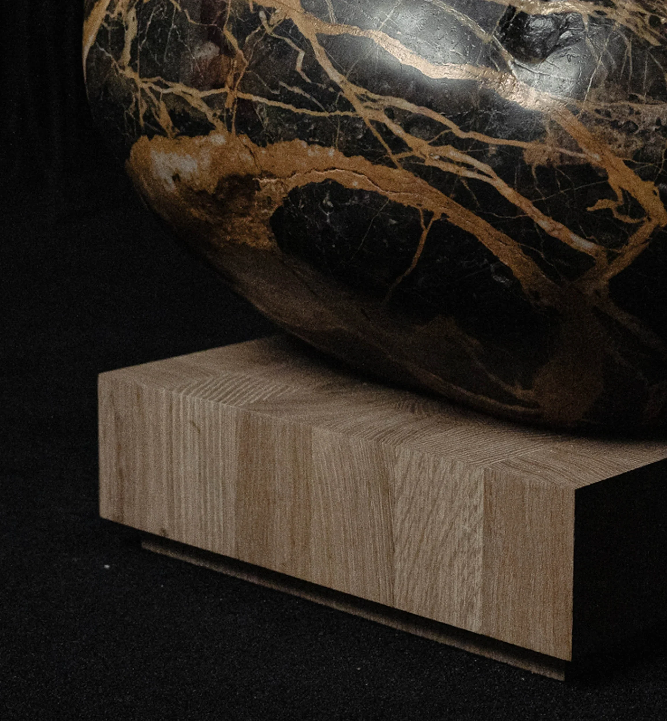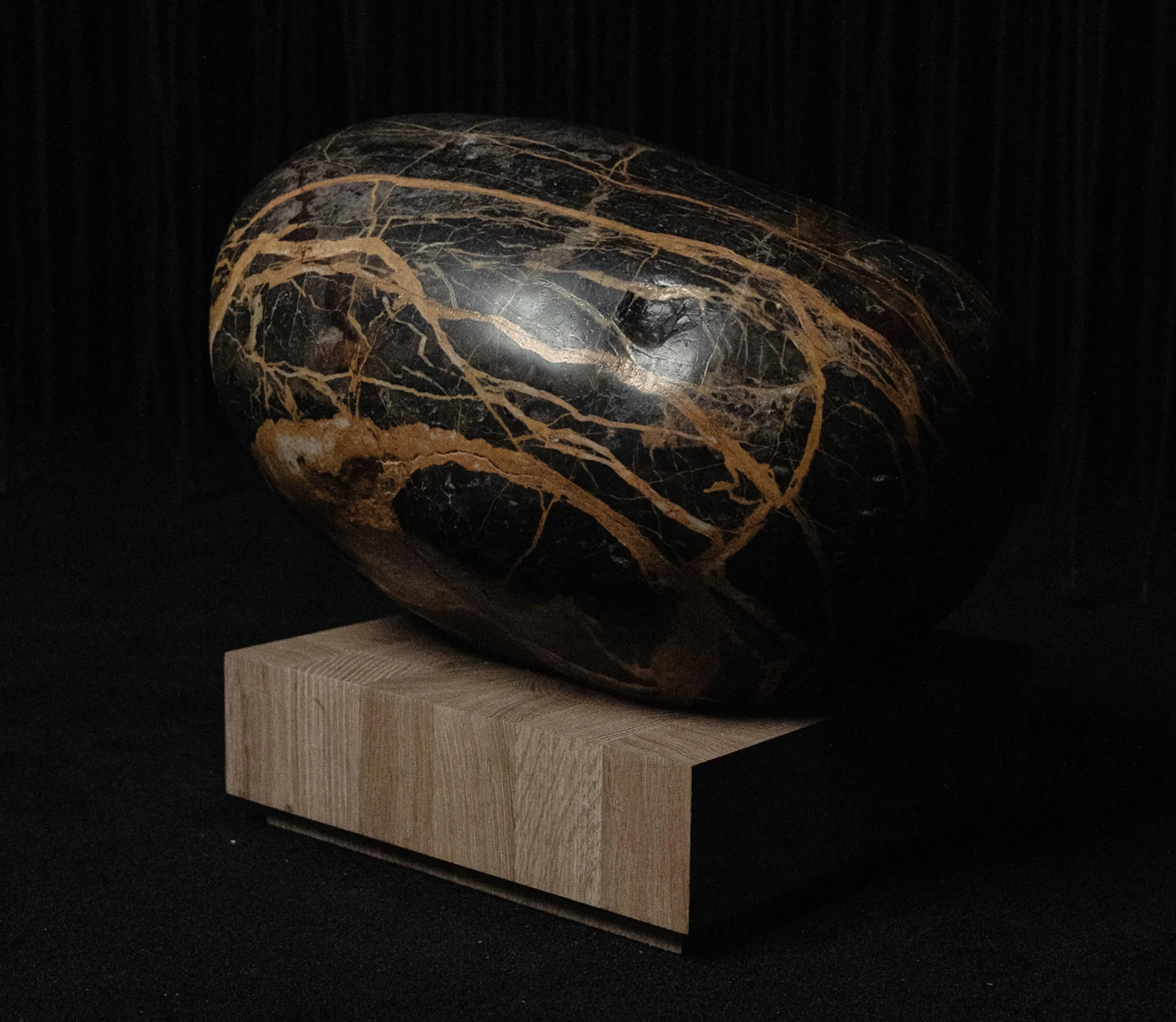Carved from marble and anchored on raw wooden bases, the works balance sensual curves with structural gravity. They are not conceived for languid comfort, but for active contemplation, inviting us to become that child whole instinctively climbs, leans, or perches upon a stone warmed by the sun. The surfaces, gently irregular and polished to a luminous finish, retain the tactile imprint of nature’s shaping hand