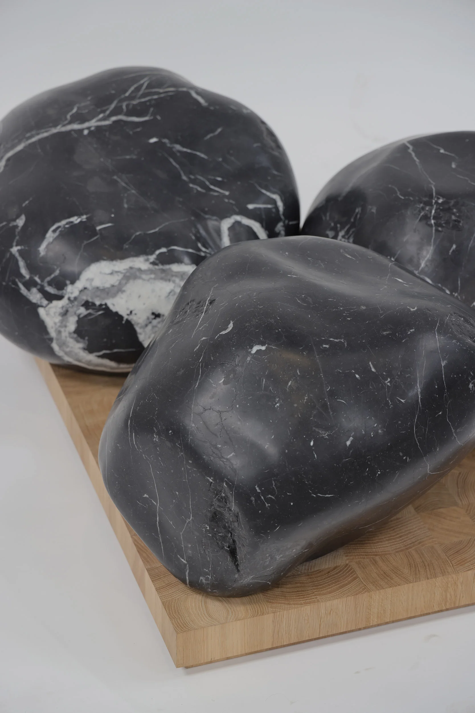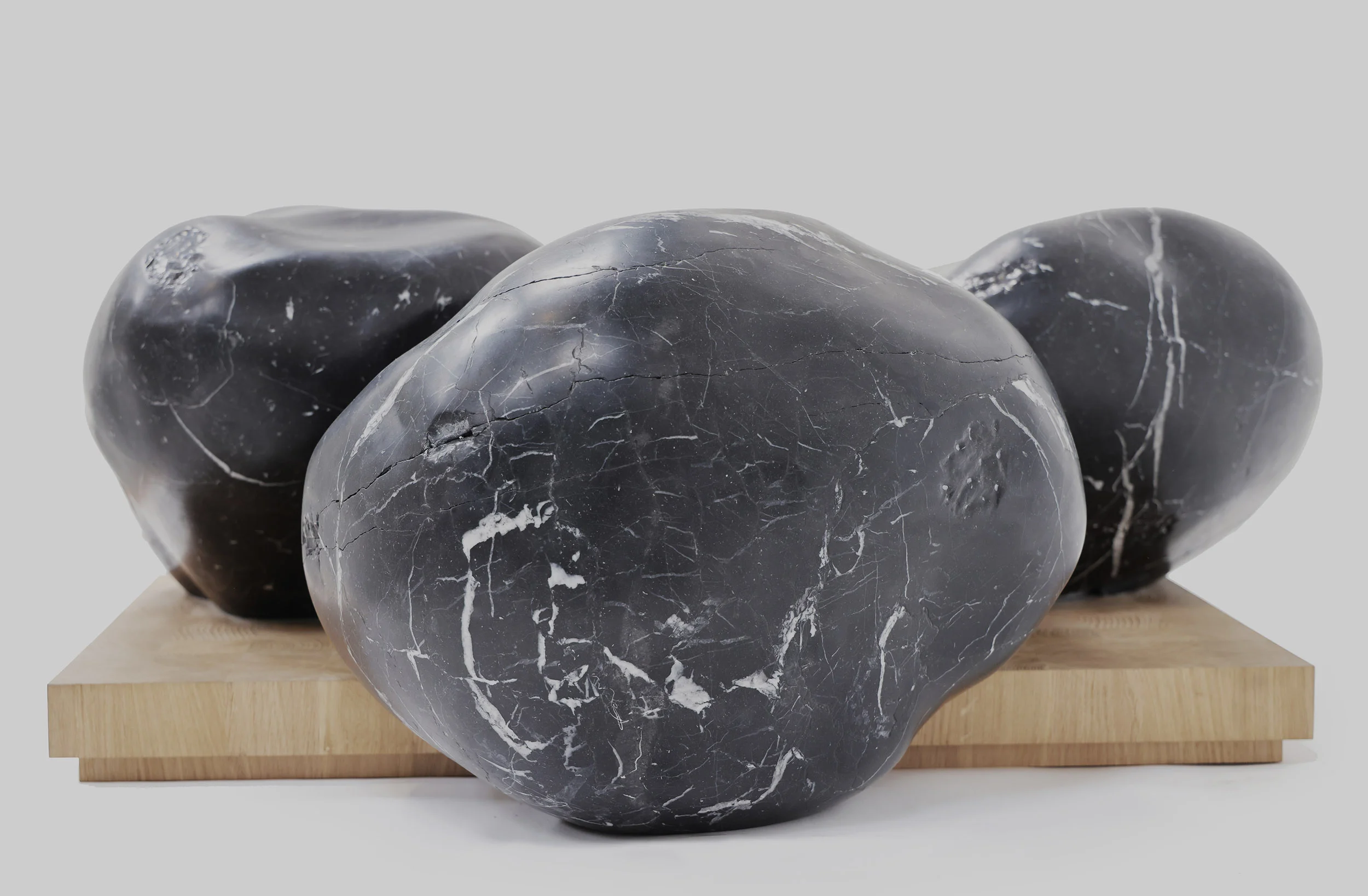 Carved from marble and anchored on raw wooden bases, the works balance sensual curves with structural gravity. They are not conceived for languid comfort, but for active contemplation, inviting us to become that child whole instinctively climbs, leans, or perches upon a stone warmed by the sun. The surfaces, gently irregular and polished to a luminous finish, retain the tactile imprint of nature’s shaping hand