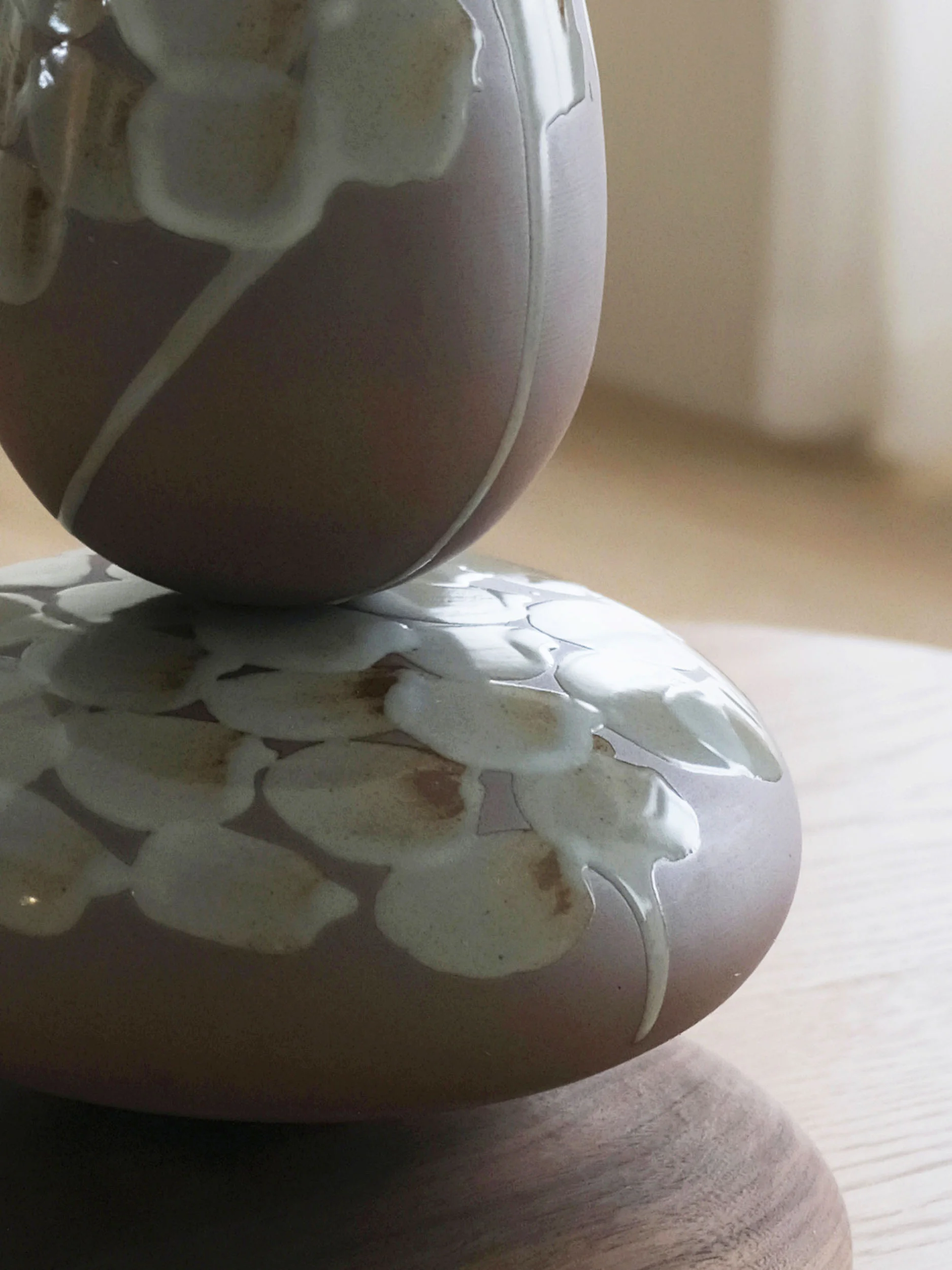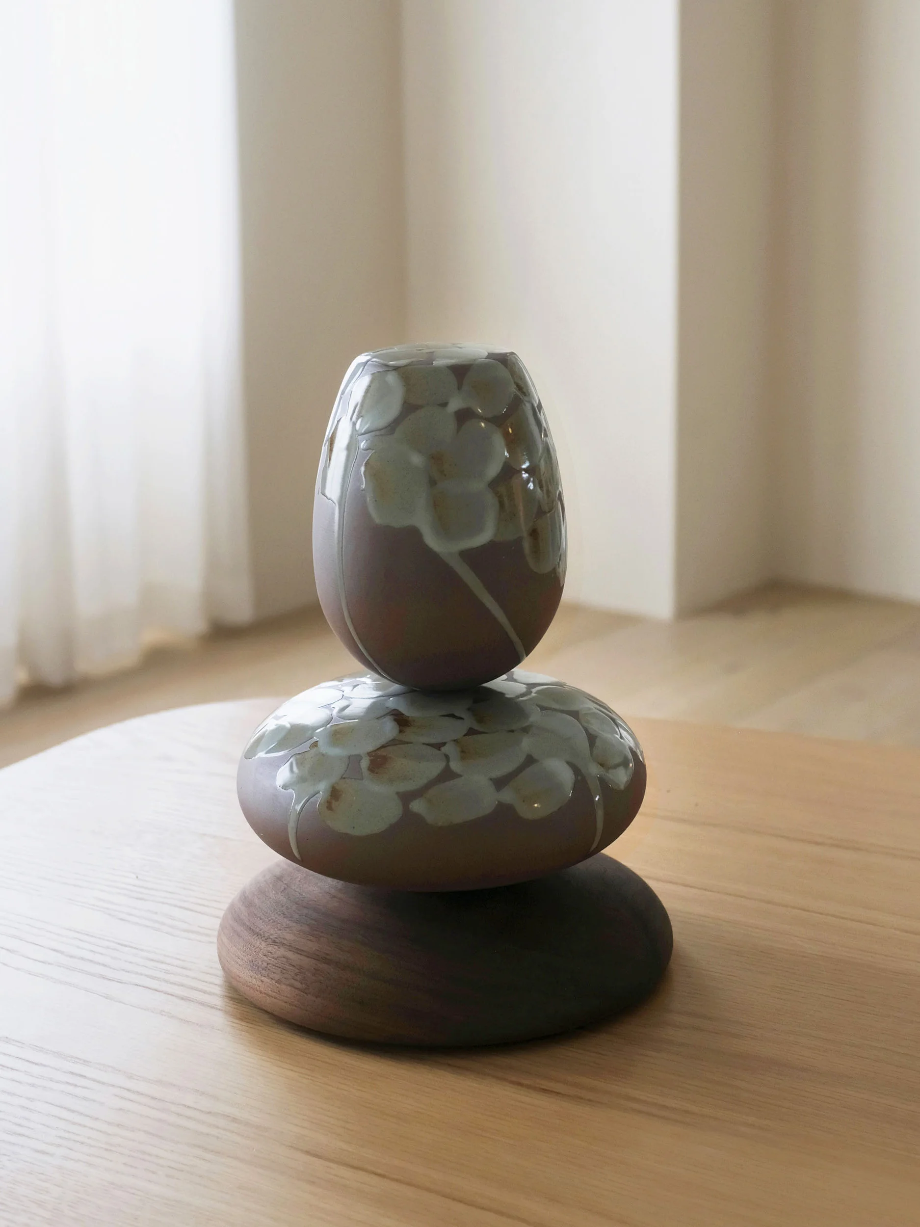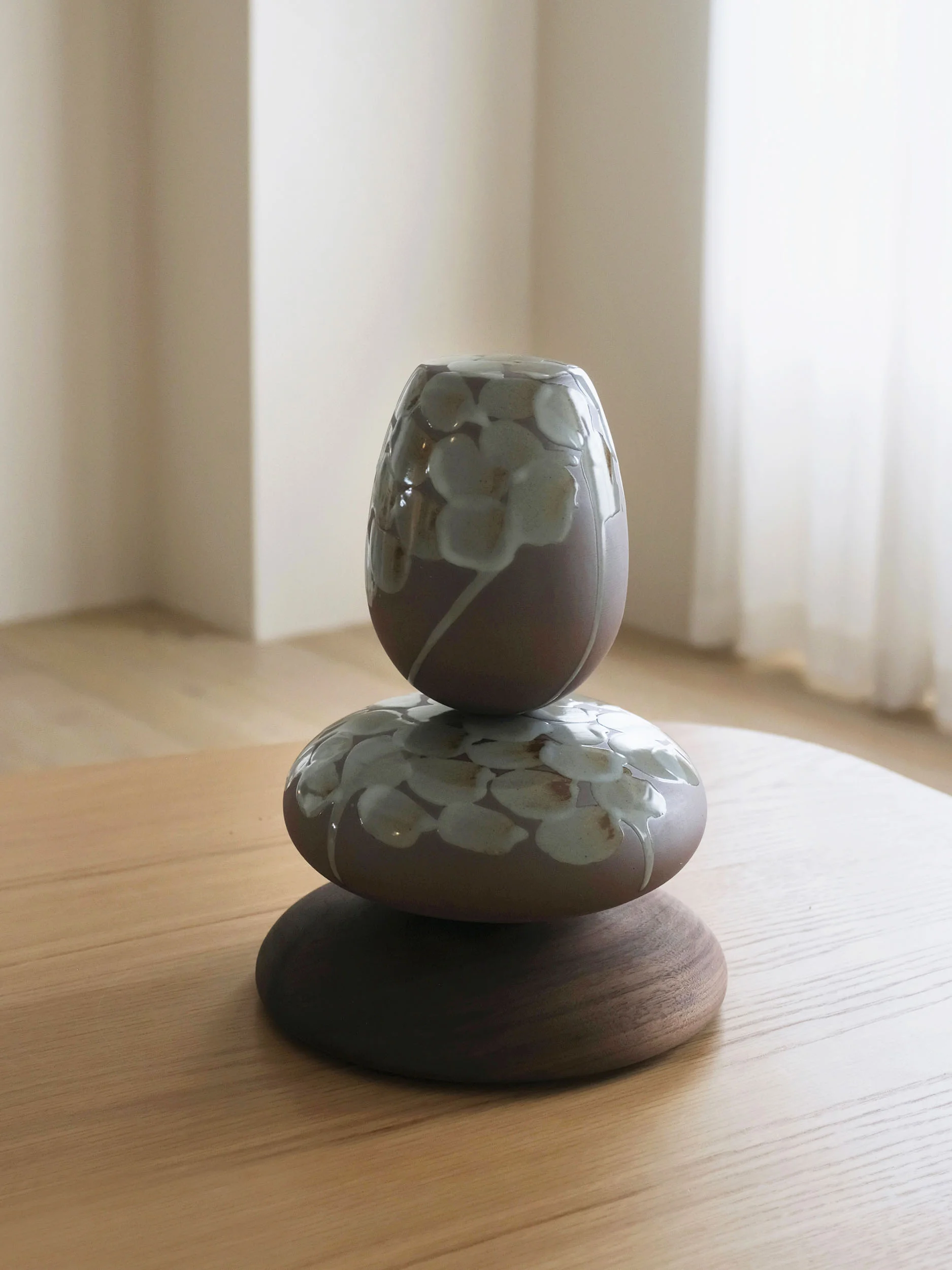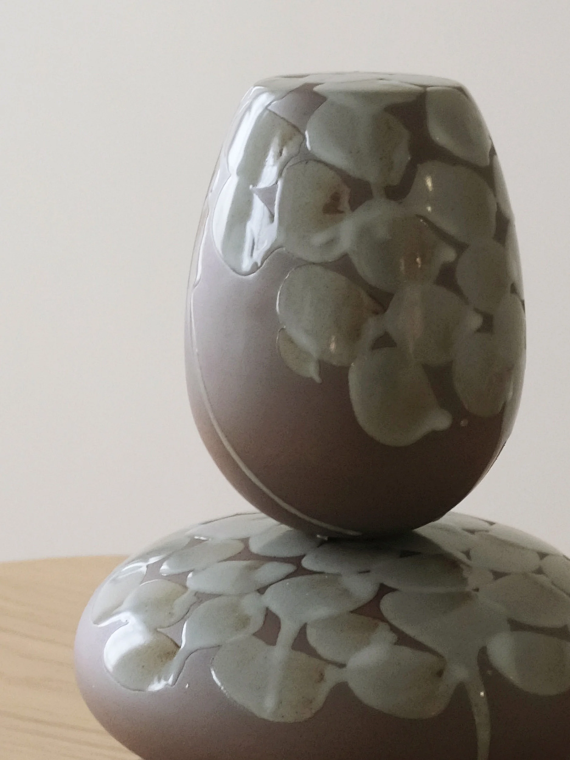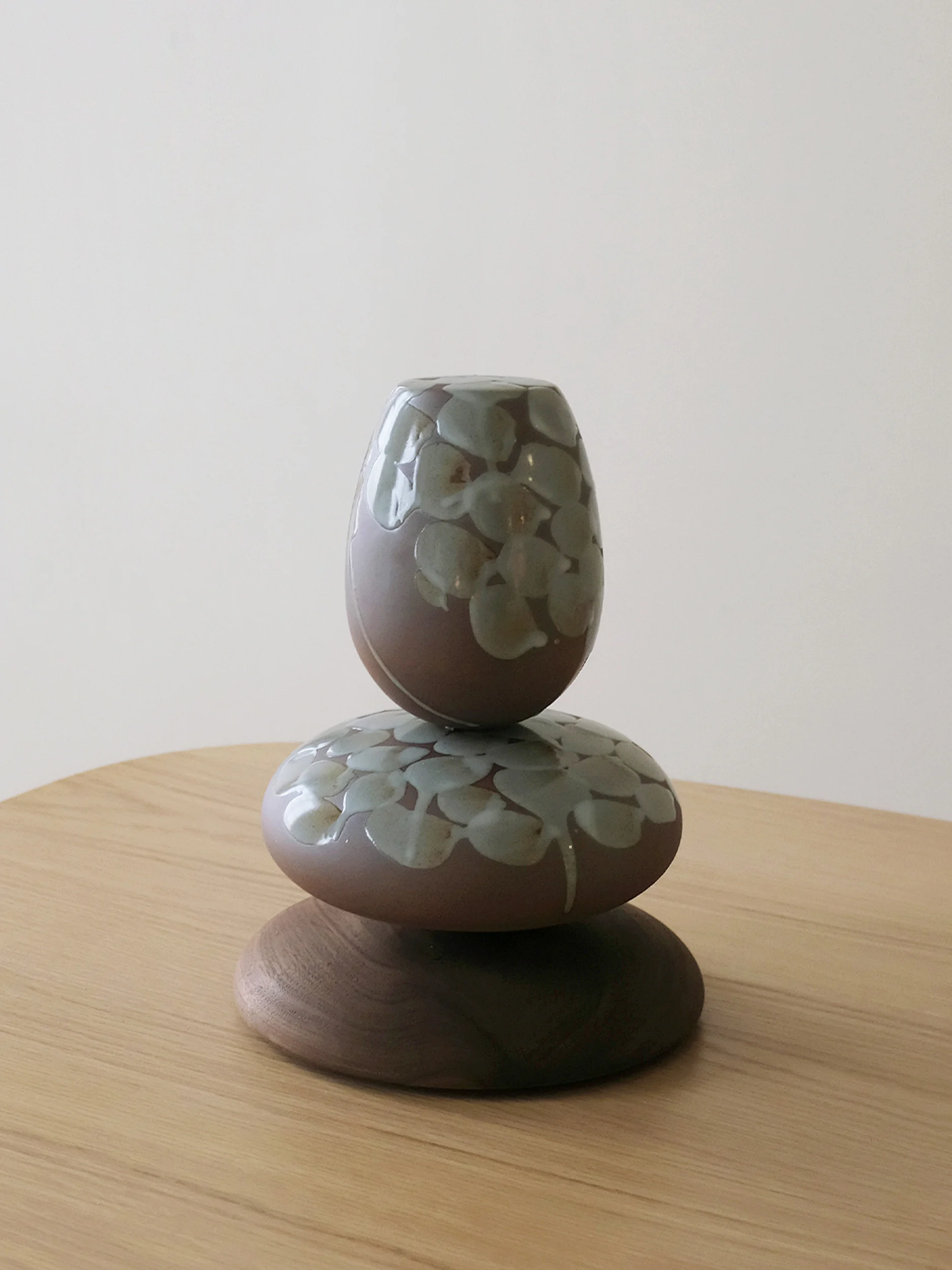 The vessels are crafted from Korean ceramic stoneware and finished with a celadon glaze chosen for its ability to articulate curvature and depth without ornament. Each form is wheel-thrown and meticulously trimmed by hand, then glazed to subtly accentuate its contours. Fired individually at high temperatures, the vessels present a notable technical challenge: rounded ceramic forms without flat bases are inherently unstable during firing, as gravity and heat can cause distortion or collapse. The successful realization of these works reflects an ambitious engagement with the limits of high-temperature stoneware ceramics