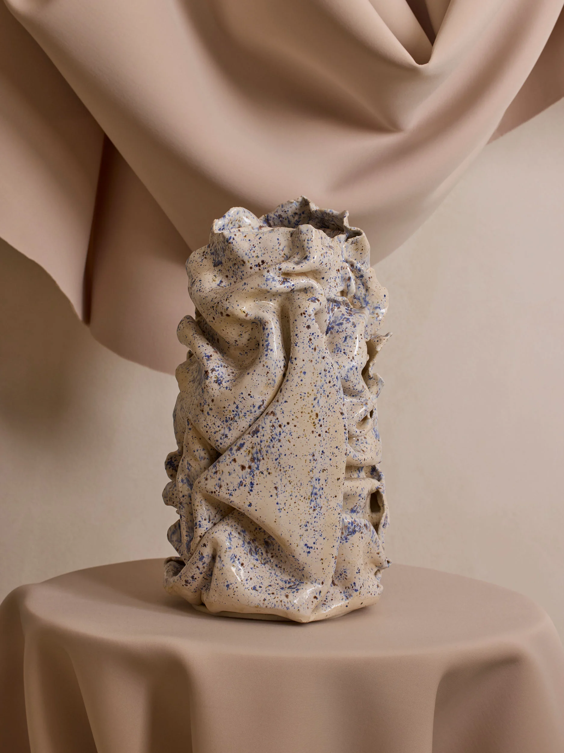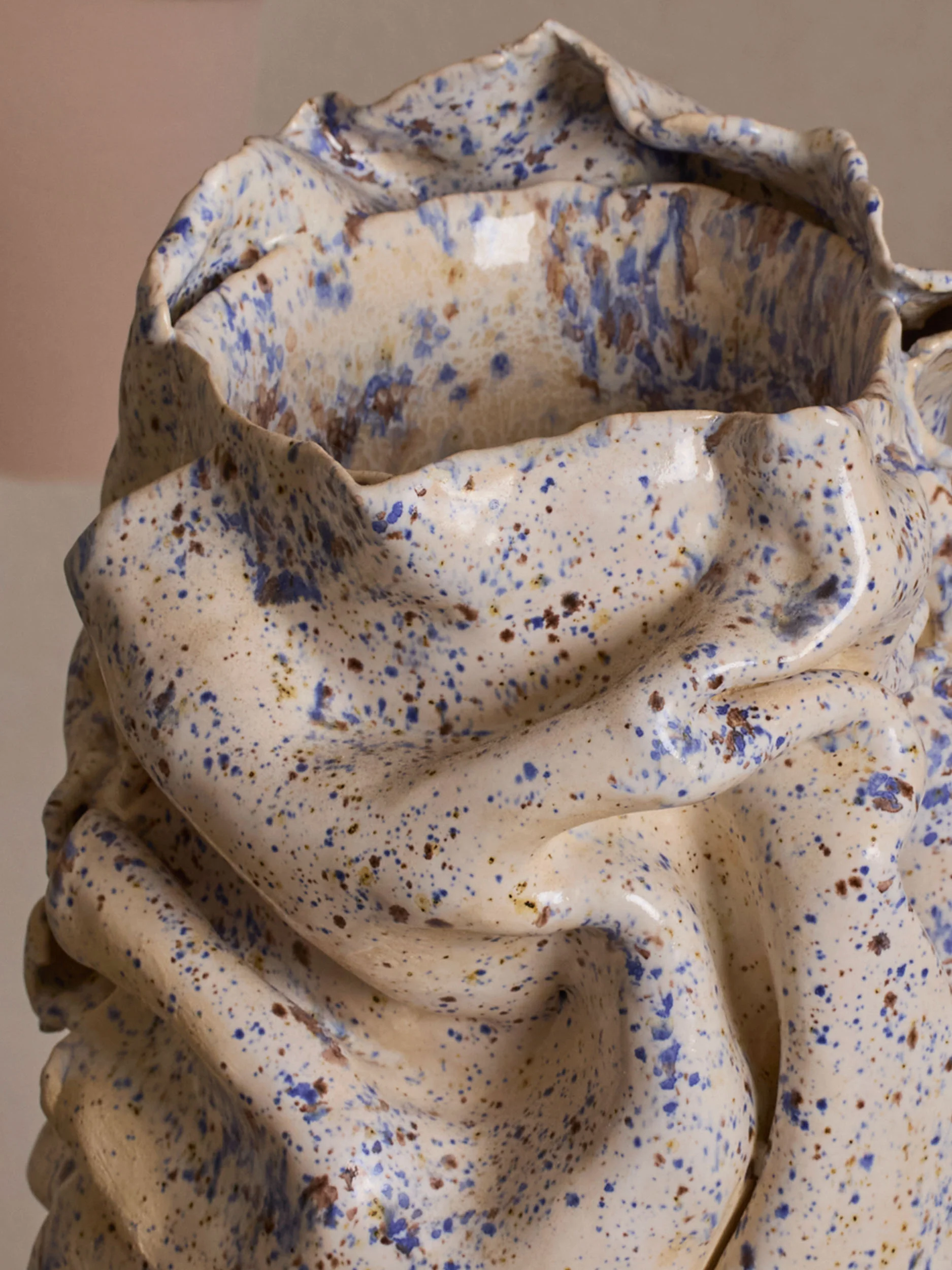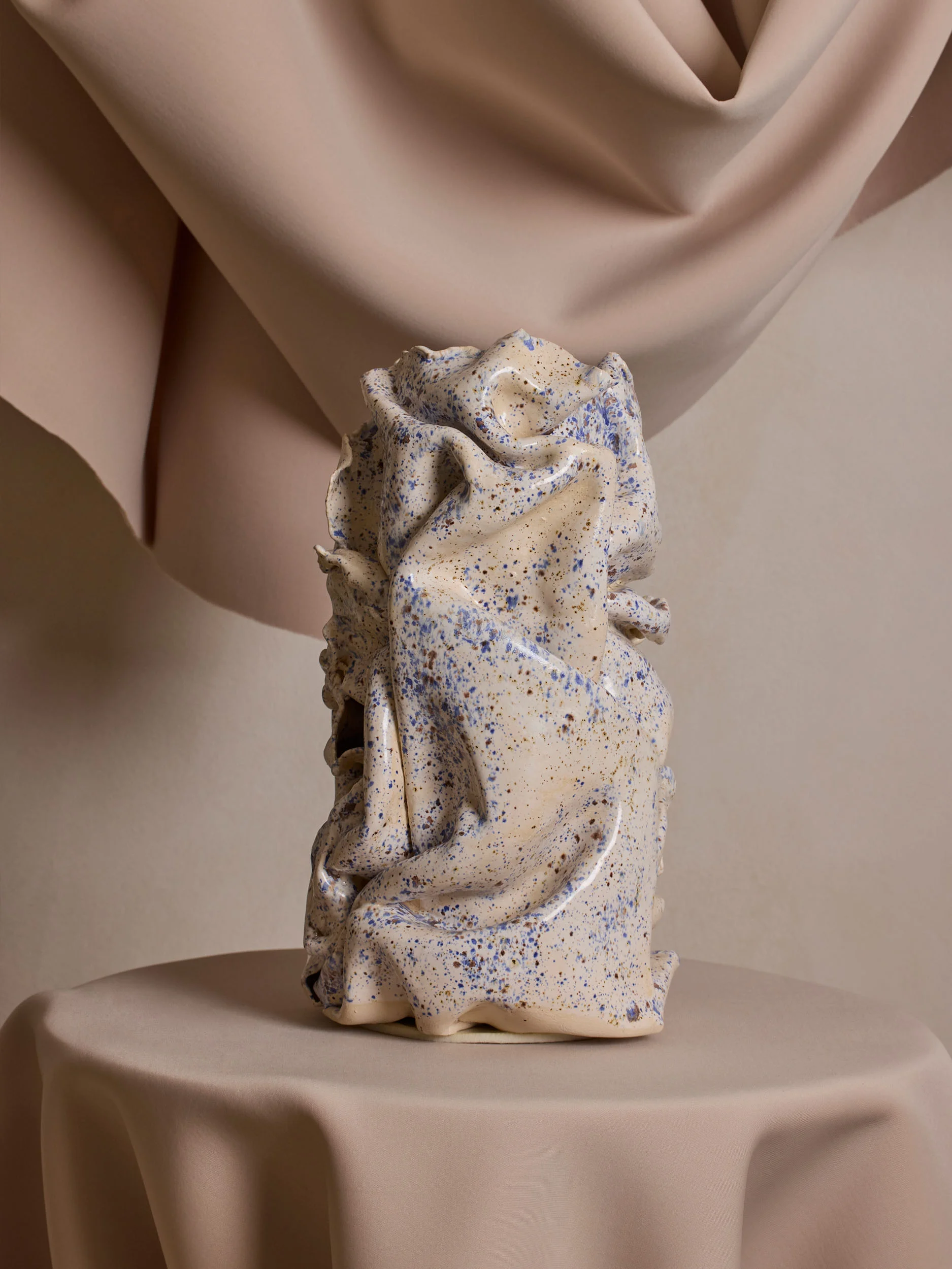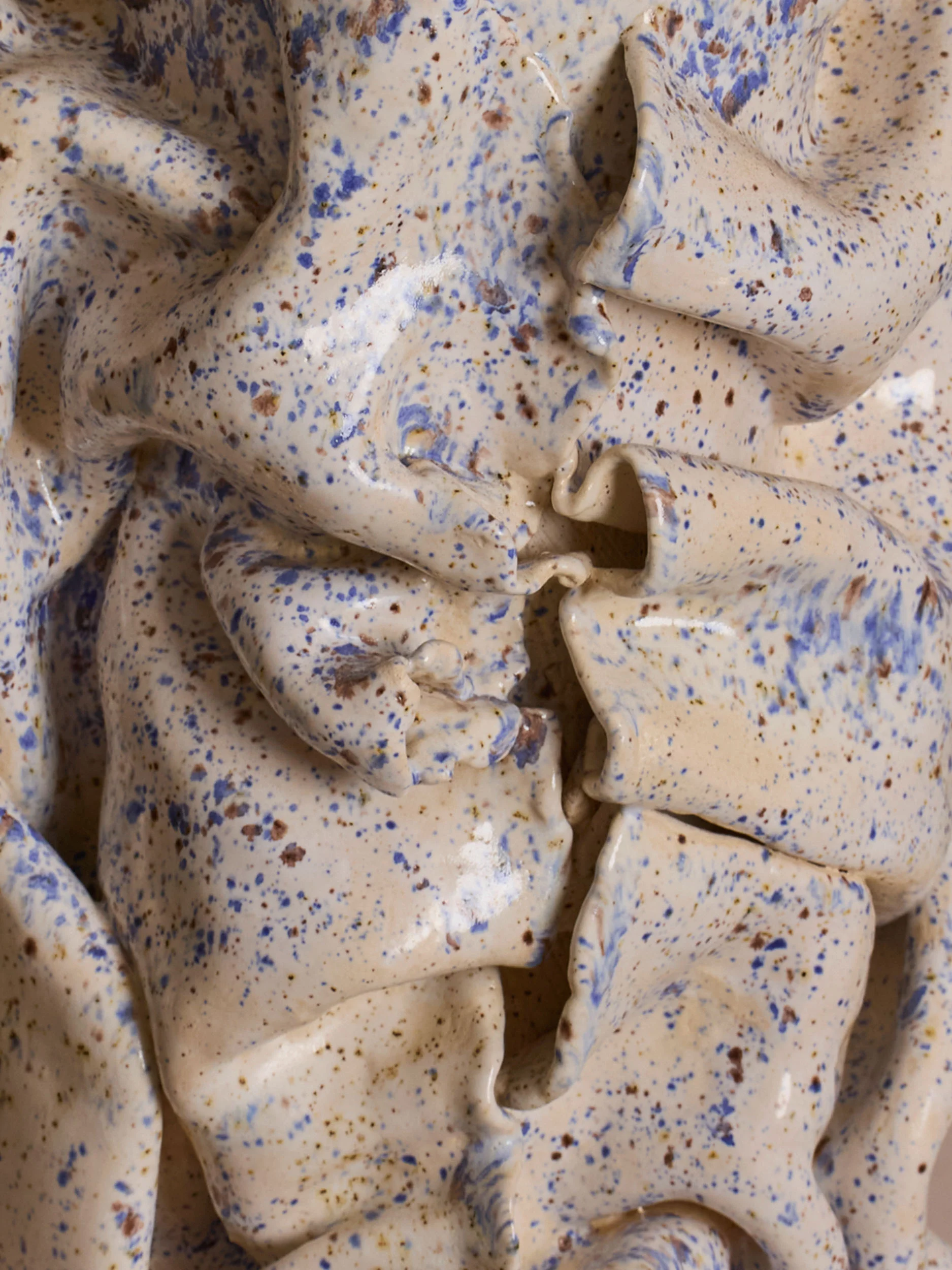 The works evoke fluidity and softness despite being rendered in rigid, heavy stoneware ceramics. Draped and folded surfaces recall fabric or ribbons suspended in motion, while textured skins resemble lava surfaces or eroded stone. Elsewhere, forms suggest organic life: sea creatures, mushrooms, moss, lichen, or primeval organisms that feel animalistic and instinctual rather than engineered